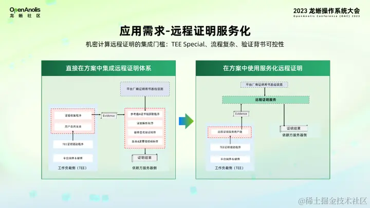大家可以看到上图左边是直接在方案中集成原生远程证明体系,需要在 TEE 侧和依赖方侧部署很多特定于 TEE 类型的软件包和程序,在依赖方的本地运行复杂的证据验证流程,并且需要和硬件厂商进行交互以获得信任根验证素材,最后才能获得一个证明结果。在这个过程中,信任完全来自于对本地程序和硬件厂商。