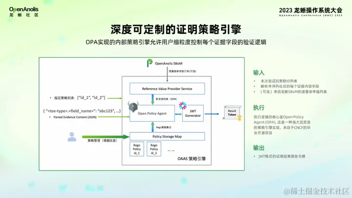 在输入端,OAAS 会把经过 TEE 验证插件处理和解析之后的序列化的证据内容和用户指定的本次验证的策略列表一同交付给 OPA 核心,这里序列化的证据内容 OAAS 定义了一种简单统一的 JSON 格式。