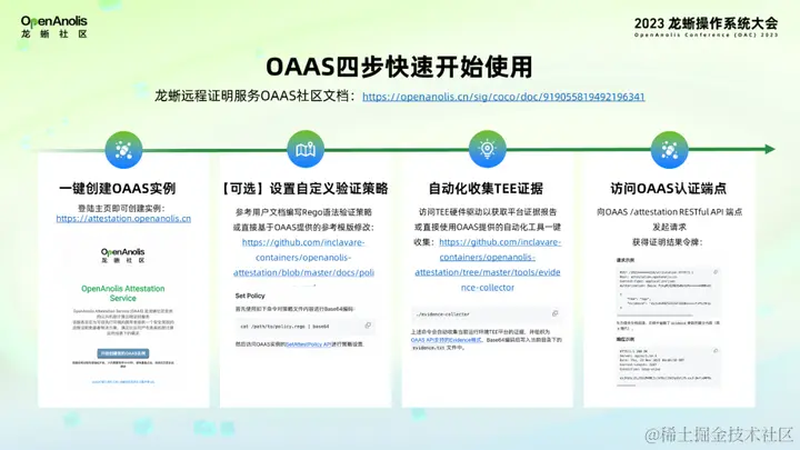 对于社区用户来说,使用 OAAS 来进行远程证明是一个非常简单高效的操作,在这下图里把开始使用 OAAS 总结为四步快速开始。