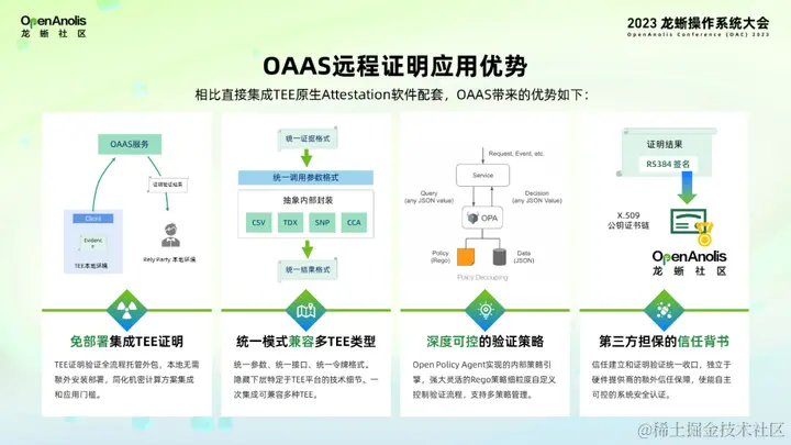 那么具体来说,在机密计算方案中使用和集成 OAAS,相比于直接集成 TEE 的原生远程证明软件配套,它的优势体现在以下四个方面。