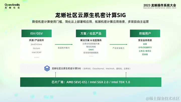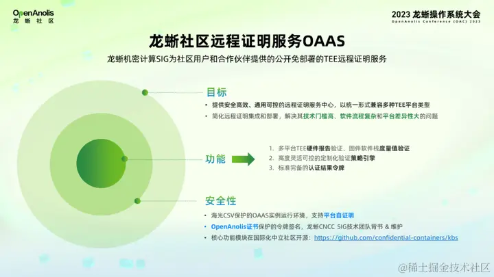 相信大家对于机密计算都比较熟悉了,它的本质上是通过硬件支持的可信执行环境对运行时的数据进行机密性和完整性的保护。对于现在的终端的使用用户和现有的云原生技术体系,机密计算技术底层的特殊性存在技术应用门槛高、部署复杂、用户不知道其功能的问题。龙蜥社区成立云原生机密计算 SIG(Special Interest Group),希望通过构建机密计算的底层基础设施的开源技术栈,降低机密计算的使用门槛,简化机密计算技术在云上的场景部署和应用,最终通过培养用户的心智拓展使用场景。在南向生态上积极和几家主流的芯片厂商建立紧密的合作关系,和合作方一起在上游社区推出一系列的组件级的开源软件。在龙蜥社区基于组件级的开源软件推出一系列解决方案或者社区产品。今天要重点介绍的 OAAS 就属于这一类,最终以上方案或者产品和社区伙伴共同打磨下具备产品级的安全能力,最终落地到共同的终端用户的实际场景中。