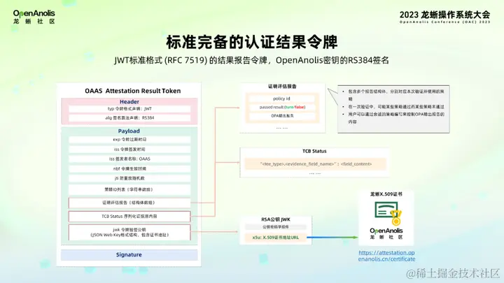 最后是一个 JWK 格式的 RSA 公钥。这个公钥可以用来验证令牌最后的 RS384 签名,值得一提的是,在 JWK 的 x5u 字段上,指向了这个公钥对应的证书链下载地址,这个证书链的根证书就是龙蜥社区的证书,因此这里的签名实际上是表征了龙蜥社区 OAAS 的背书。