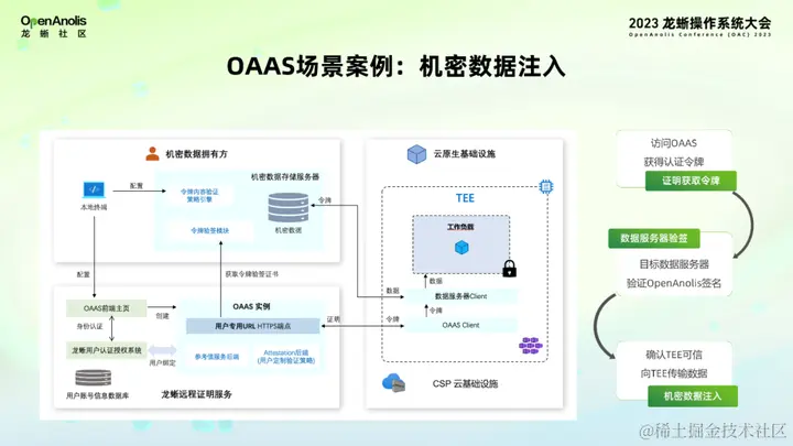 在方案流程上,首先是 TEE 内的 OAAS client 访问 OAAS 实例执行证明获得令牌,然后 TEE 将令牌提供给机密数据存储服务器,存储服务器通过验证令牌,就可以知道这个 TEE 的真实性和安全性是经过 OAAS 验证和担保的,因此可以将机密数据通过加密信道返回给TEE。这就是借助 OAAS 的证明能力实现的安全数据注入。