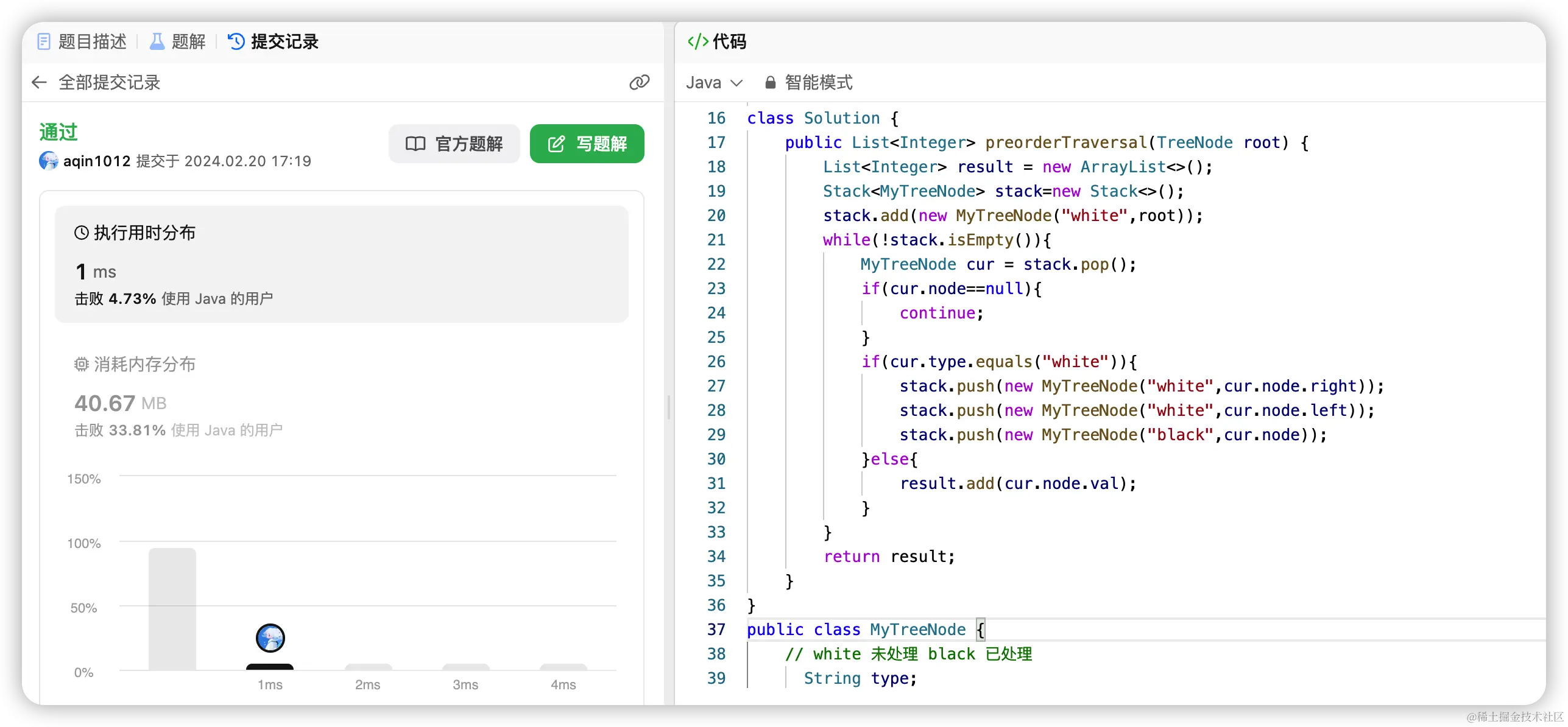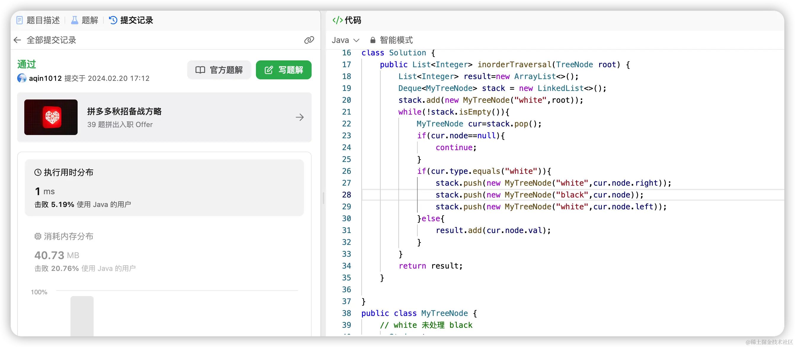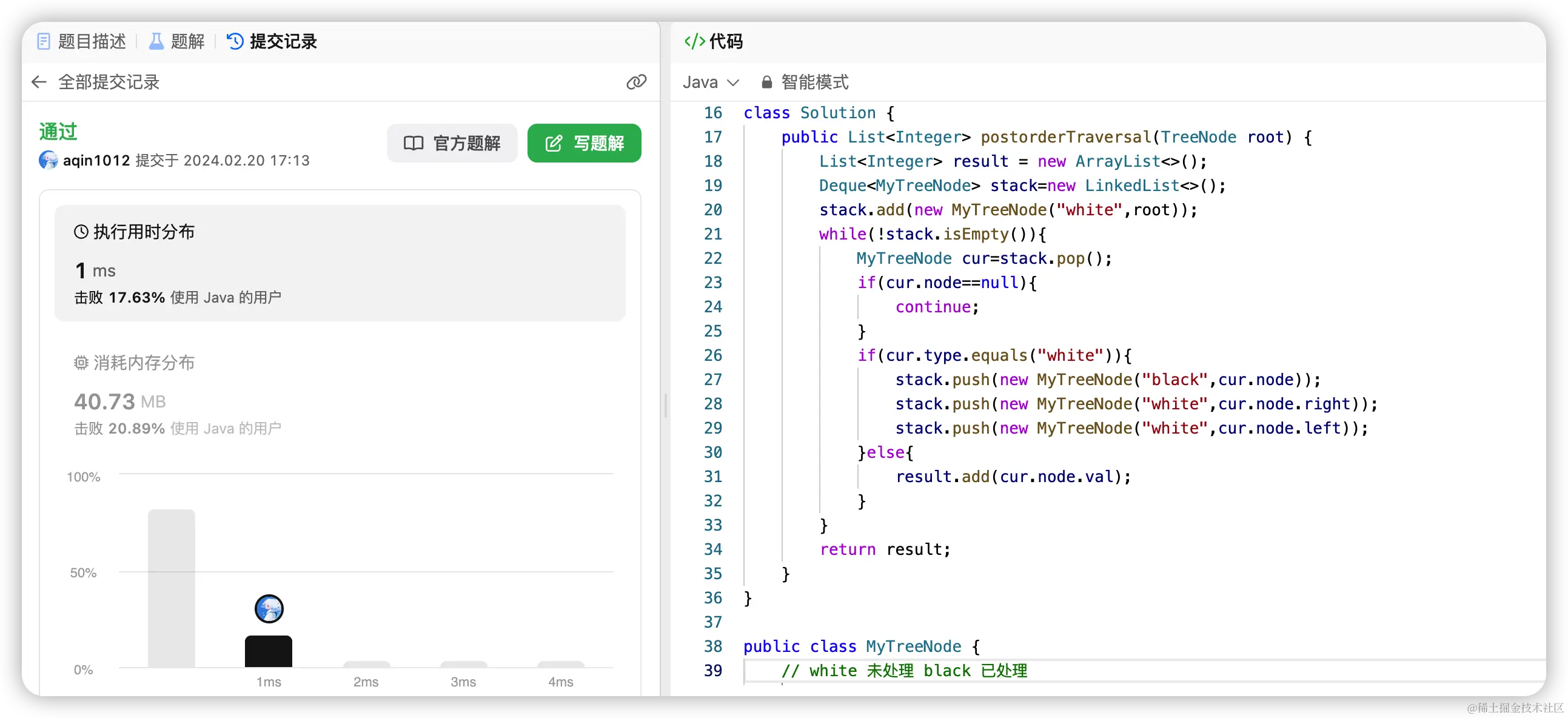 卡哥在代码随想录中提供了一种适用于三种遍历方式的统一写法,用这种统一的写法,先序遍历、中序遍历、后序遍历也像递归法一样只需要进行位置上的简单调整即可,这种统一写法的基本原理就是在处理过的节点再次入栈时,后面紧跟着添加一个“null”,当遍历到“null”时,说明下一个节点已经访问过了,直接添加到结果集即可。