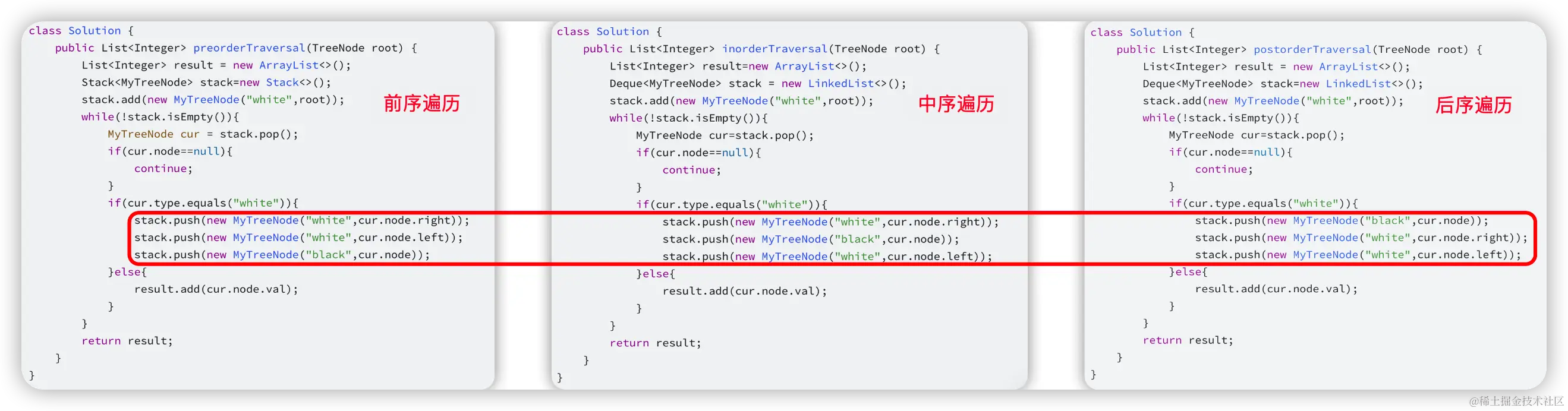 可以看到只是在入栈顺序进行了调整,就完成了这三种不同的遍历顺序