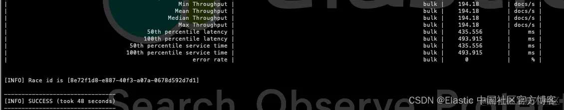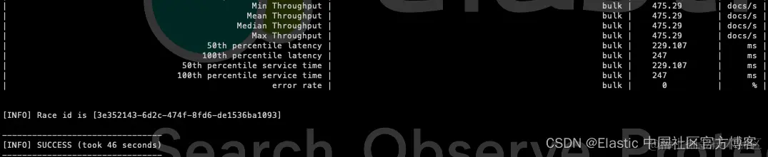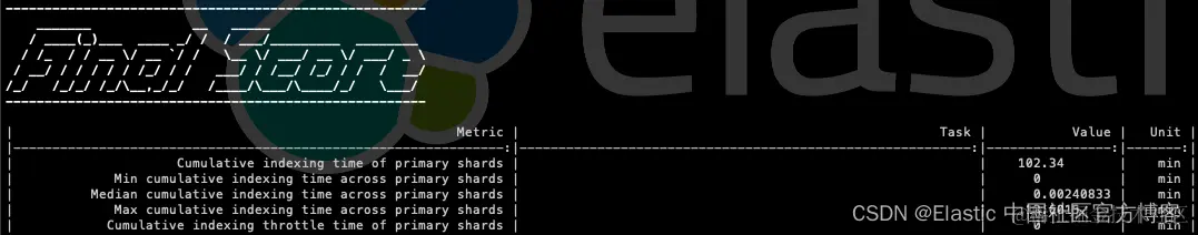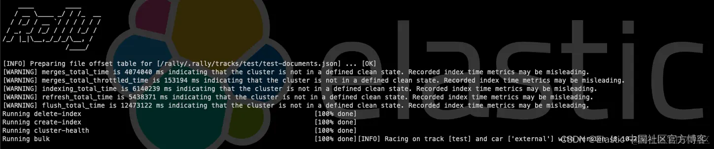 我们使用 benchmark-only 的 pipeline 类型在已经运行的集群上启动它,这就是为什么我们可以看到警告,告诉我们所采取的不同步骤可能具有误导性的指标,此外还可以看到在 track.json 文件的 “schedule” 部分。