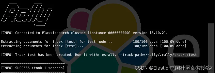 注意:目前,ES Rally 在创建自定义赛道时是单线程的。 这是为了避免影响集群或运行任务的计算机的性能。 因此,此过程可能需要一些时间才能完成。 使用 screen 或 tmux 等虚拟终端将允许你在后台运行该进程。