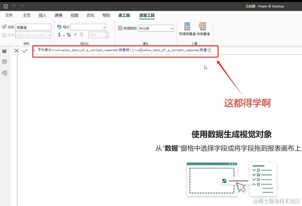 在进入PowerBI 后正上方有一个“新建度量值”进去后来看截图