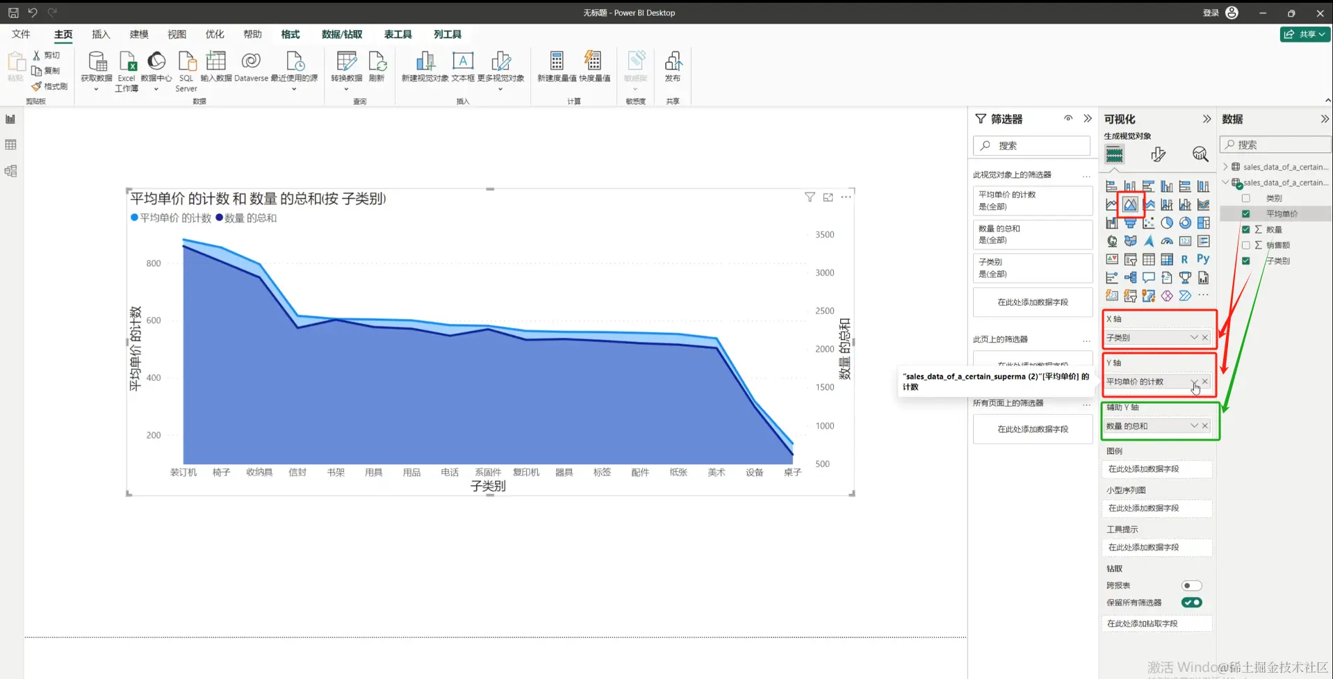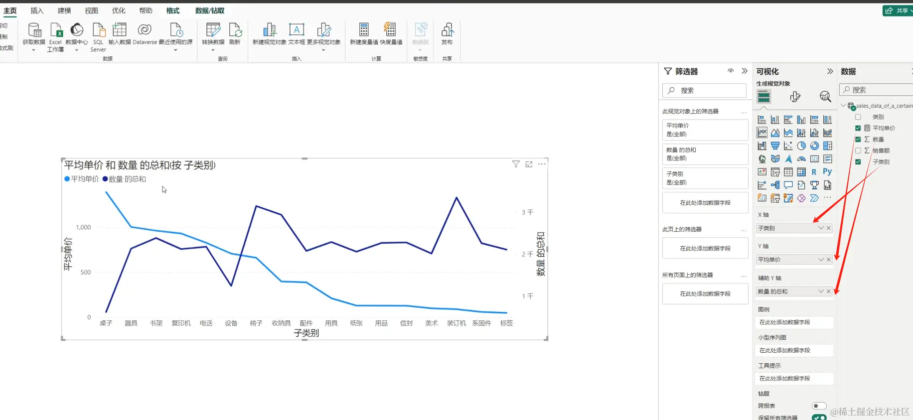 先确定X/Y轴关系,然后选择对应的坐标,最后发现根本不对,又通过各平台查找如何表达出“各子类别的平均单价”才知道需要DAX 函数。又找到自己需要的对应函数,整个过程就不多赘述了,总之要崩溃。