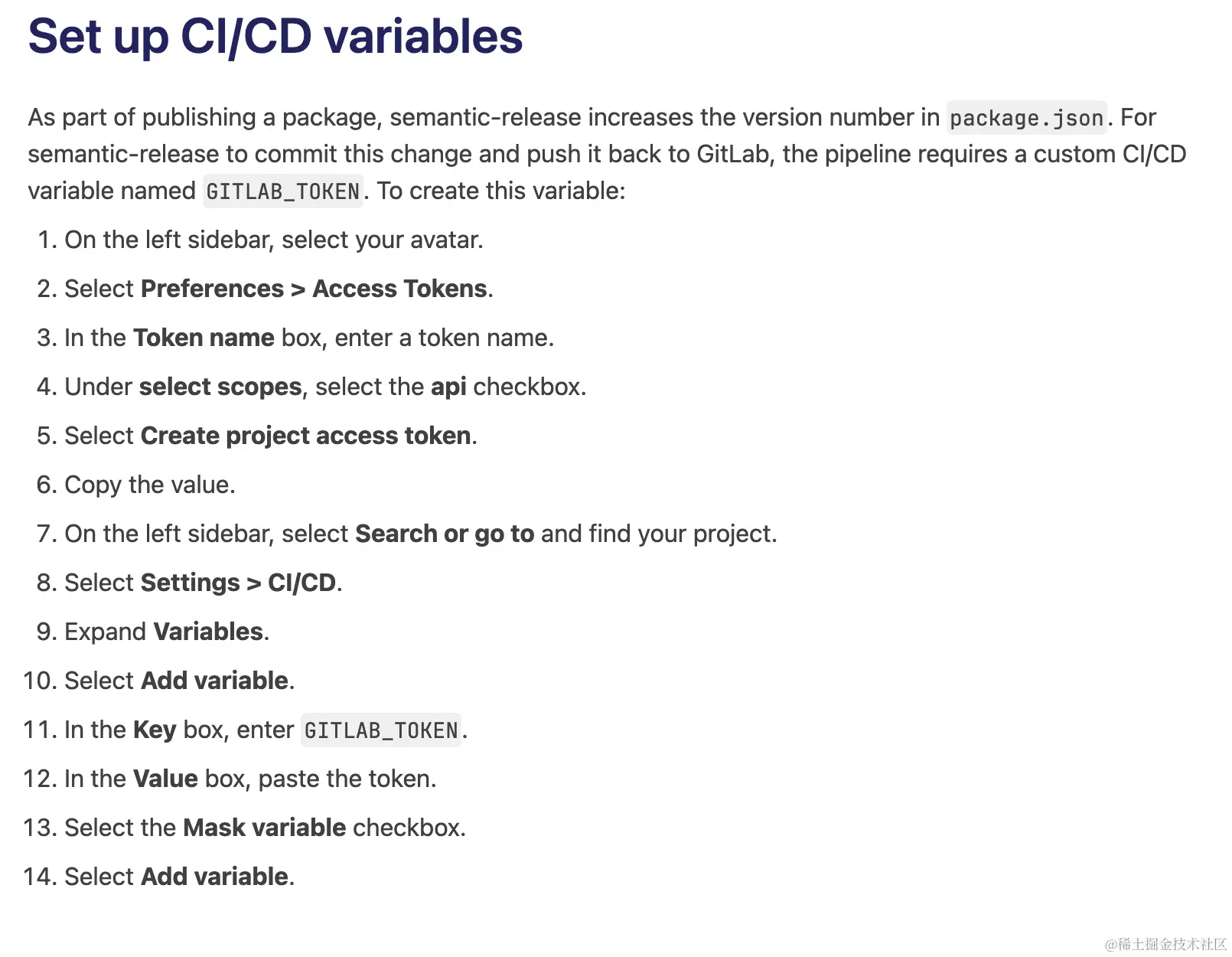 semantic-release在package.json中增加版本号。为了让semantic-release能够提交这个更改并推送回GitLab,流水线(pipeline)需要一个名为GITLAB_TOKEN的自定义CI/CD变量。