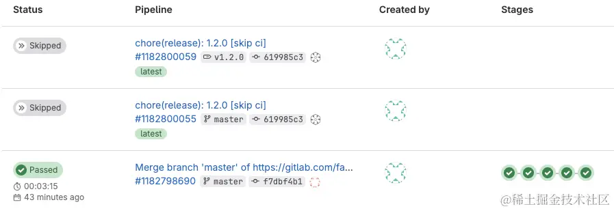 由于我们配置了semantic-release,只要我们git push本地代码到gitlab,然后后续所有的流程就交由gitlab负责。