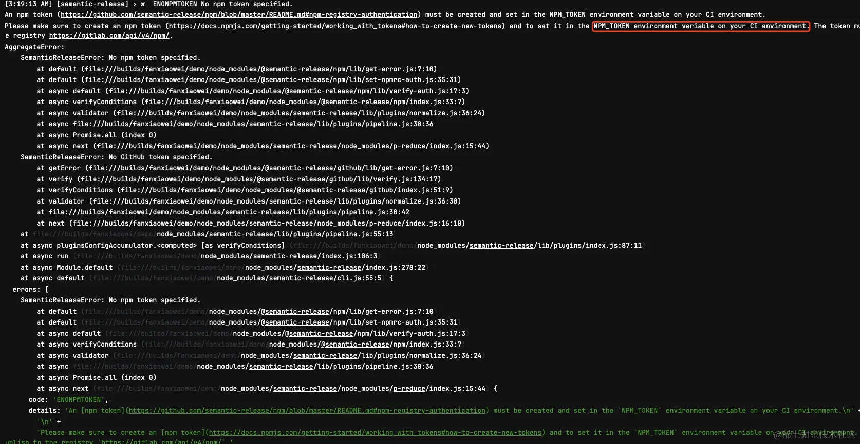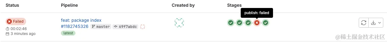 我们看到publish stage失败了,我们回头看我们的.gitlab-ci-yml配置,发现在publish阶段有一个环境变量(AUTH_TOKEN),这个AUTH_TOKEN其实就和我们上一节讲的token是一样的。这里就不在过多说明。
