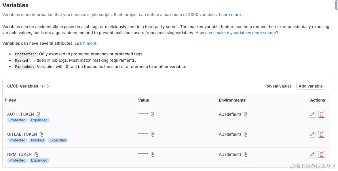 我们可以在Settings->CI/CD->Variables中设置相关的环境变量。