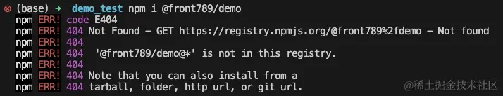 从错误中看到在执行npm i @front789/demo命令时候,命令行提示在https://registry.npmjs.org不存在@front789/demo。