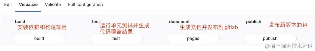 pages:文档生成阶段的任务,依赖于构建阶段。在构建成功后,将docs/目录下的文件复制到.public目录,并将.public目录重命名为public,然后将public目录作为构件保存。这个任务只在master分支和标签上执行。 -