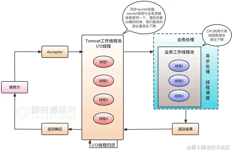 同步 servlet 容器,servlet 线程与业务逻辑线程是同一个,高峰期流量上涨或者尤其是遇到流量尖峰的时候,servlet 容器线程被阻塞的时候,我们服务的吞吐量就会明显下降。