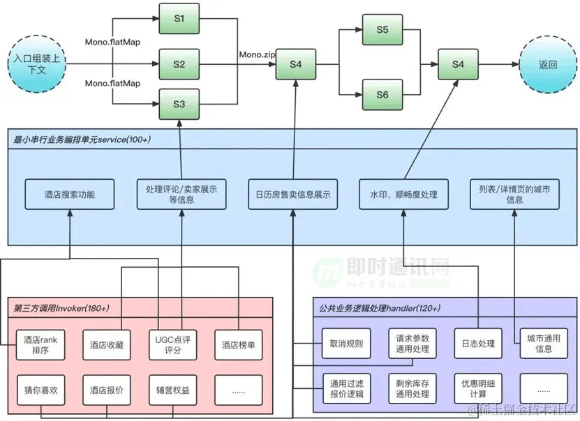 在复杂的 service 中我们会根据实际业务需求组装 invoker 和 handler,例如:日历房售卖信息展示 service 组装了酒店报价、辅营权益等第三方调用 invoker,优惠明细计算、过滤报价规则等共用的逻辑处理 handler。