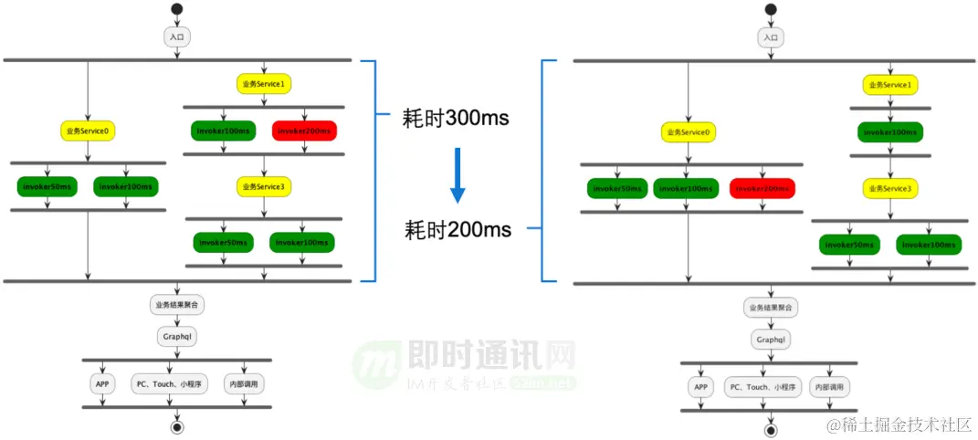通过系统内 invoker 的最优编排,整体接口的响应时间就会从300ms 降低到200ms。