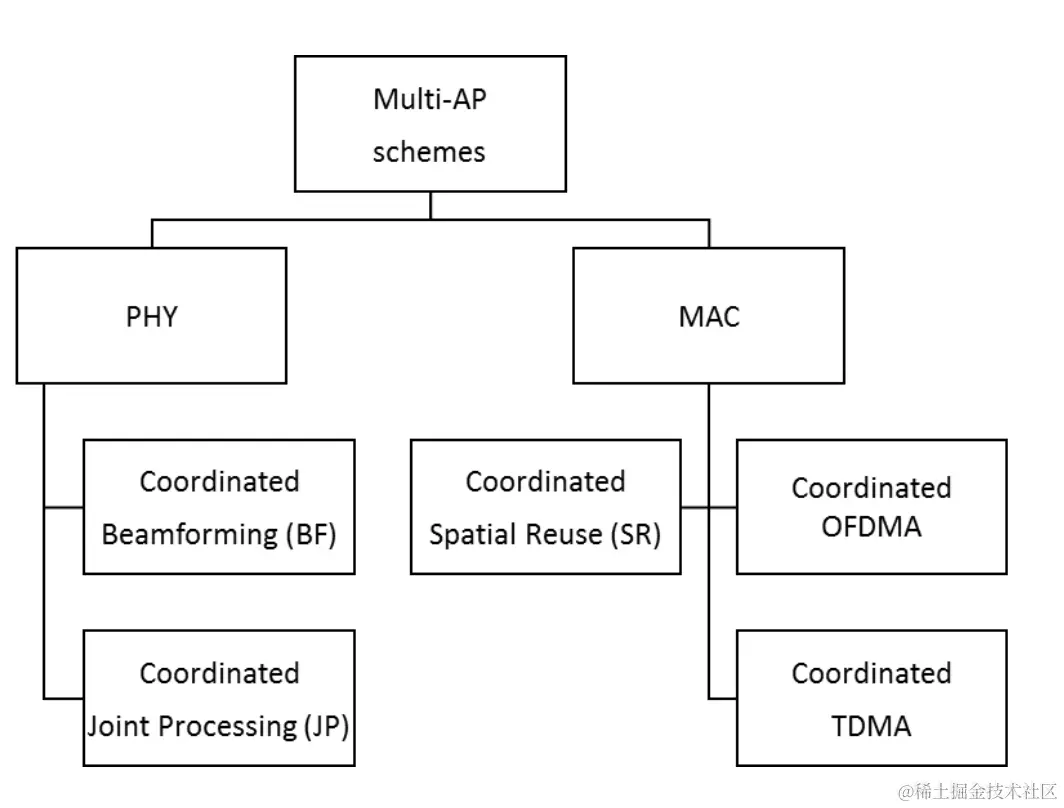 There are many methods for cooperative scheduling between multiple APs, including C-OFDMA (Coordinated Orthogonal Frequency-Division Multiple Access), CSR (Coordinated Spatial Reuse), CBF (Coordinated Beamforming) and JXT (Joint Transmission), etc.