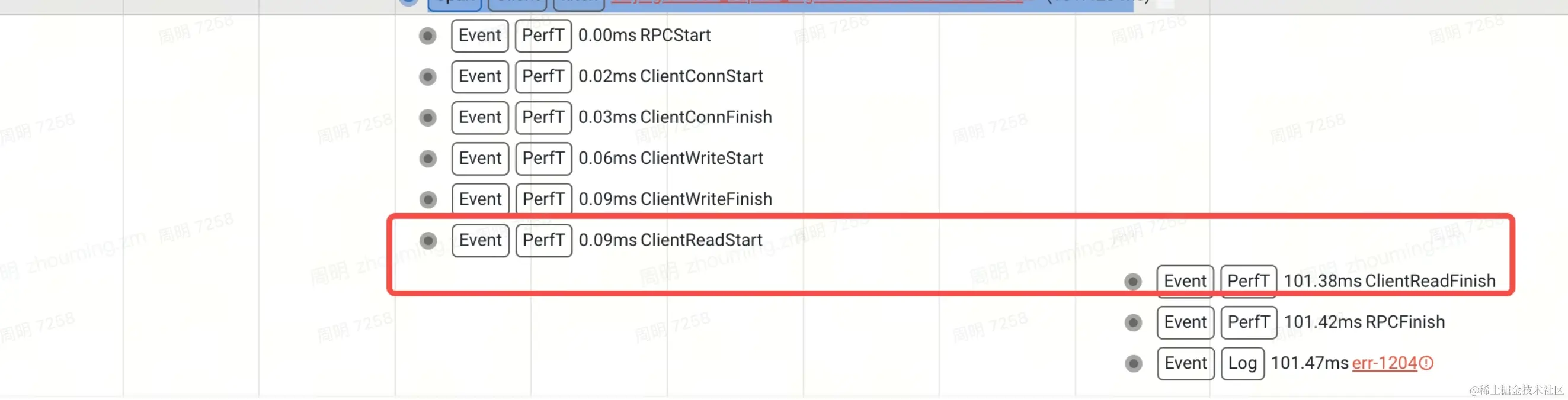 调整超时时间到200ms后,通过图3.3.2发现超时基本没有任何变化,所以排除偶发性超时问题。3.4、RPC耗时拆解分析
