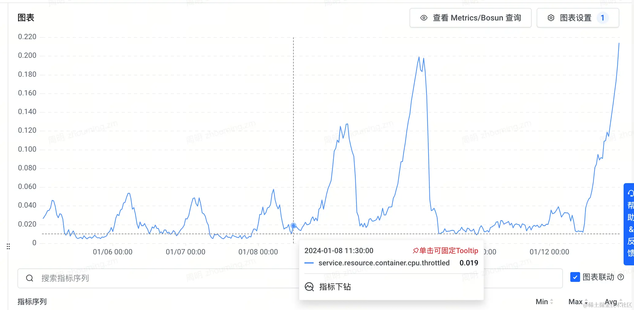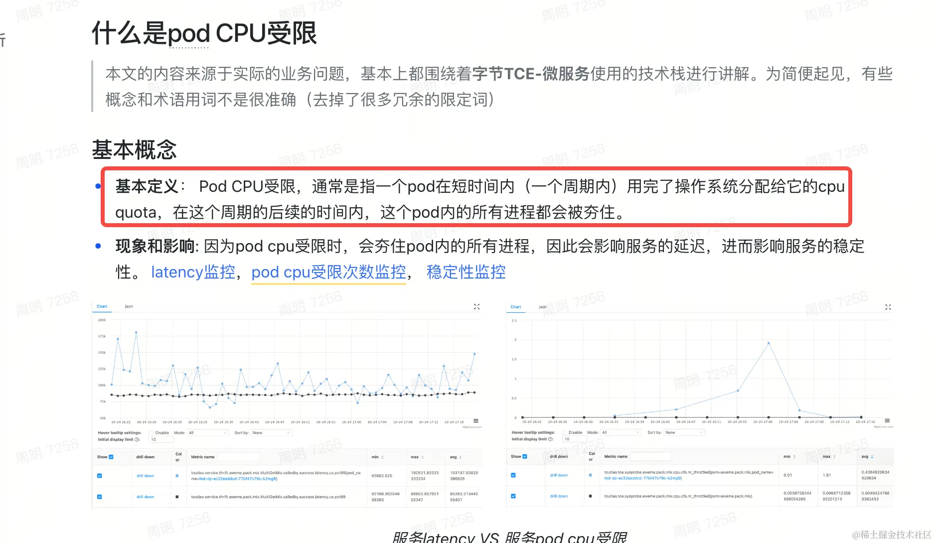 根据上面监控发现CPU受限非常频繁,但是CPU使用率却比较低,那么到底是什么原因呢?于是拉了oncall沟通,没有提供太多有用的信息,oncall反馈这个一般是业务的问题,只能业务自己来排查,建议扩容服务数量或者扩容CPU核心数。既然oncall无法提供有用信息,所以思考CPU受限一般是什么情况下发生的呢?找了下文档,果然找到了。