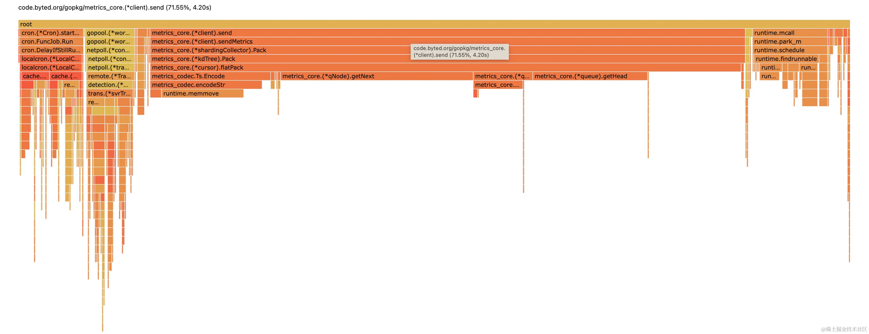 上面的CPU核心数扩容只是缓解了问题并没有找到真正的原因。要想找到根因那么只能分析POD分配的CPU时间到底花到哪里去了。经过内部文档查询可以通过火焰图来分析POD的CPU时间消耗分布。