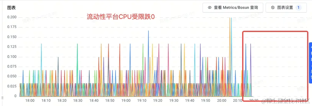 代码下线后,根据上图图3.7.1、图3.7.2以及图3.7.3分析server端的CPU受限降到0、client端的超时数量降到0,client端视角的SLA上升到100%,于是可以确定接口超时的根本原因:因为打点过快占用了大量的CPU时间导致接口处理后返回的时候分配给server端POD的CPU时间使用完了导致夯住所致。