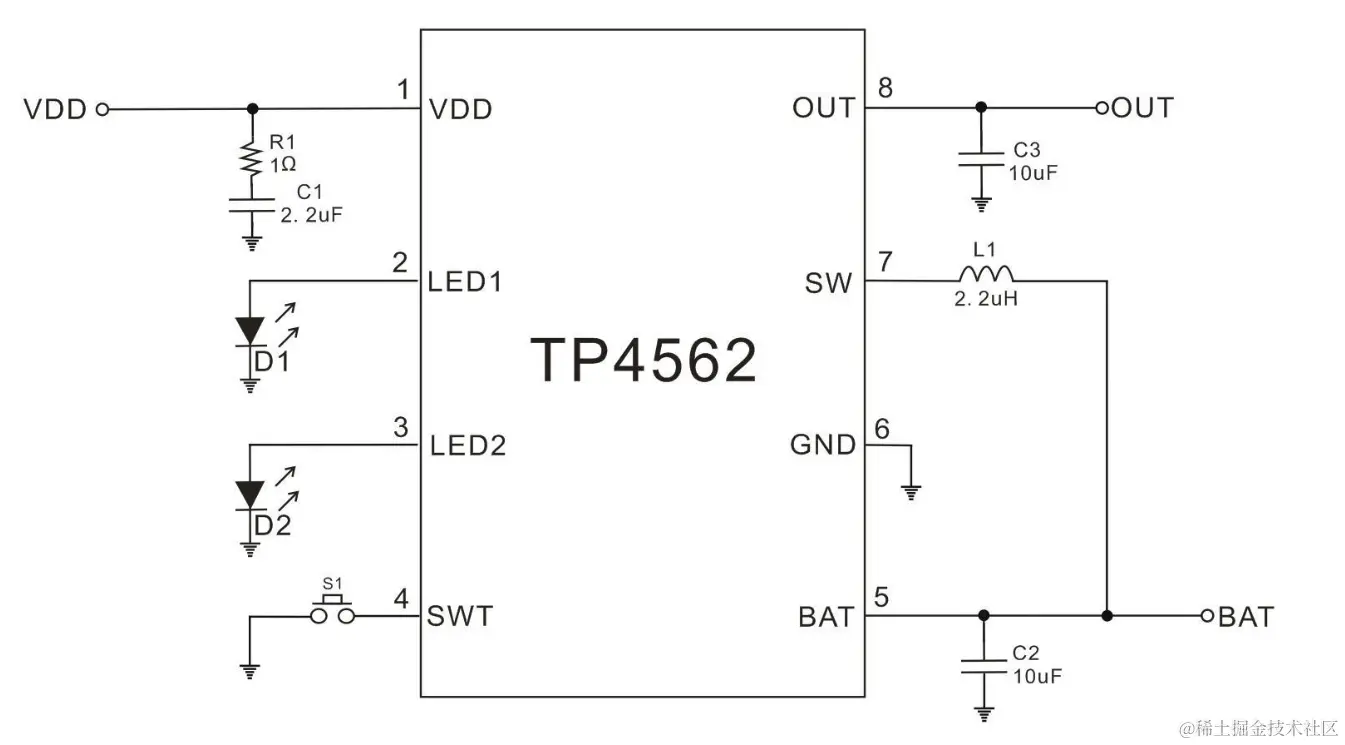 TP4562 应用电路简单,只需很少的外围元件便可以实现锂电池充放电的完整方案,极大的节省了系统的成本和体积。