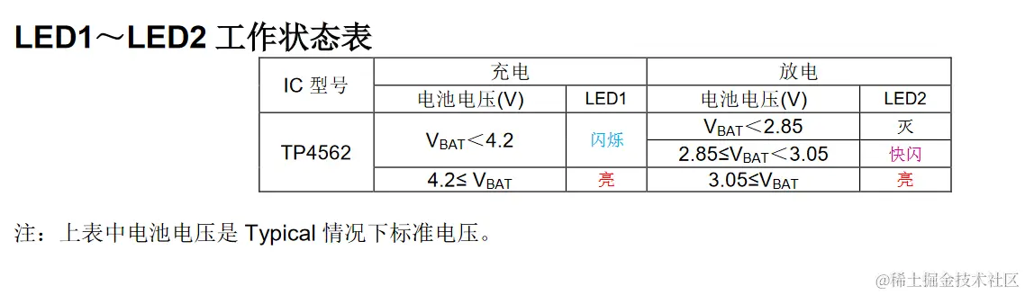 启动时,当 BAT 电压大于 3.15V 时,升压电路开始工作,工作过程中如果电池电压低于 3.05V,则 LED2 会以 2HZ频率快闪提醒电量较低,当电池电压低于 2.85V,则放电输出关闭,TP4562 进入低电流待机模式。