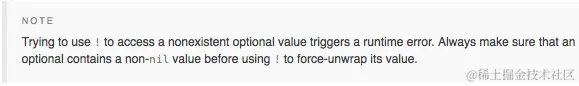 Swift 文档在一个注释中提到,你应该谨慎使用强制解包的方法: