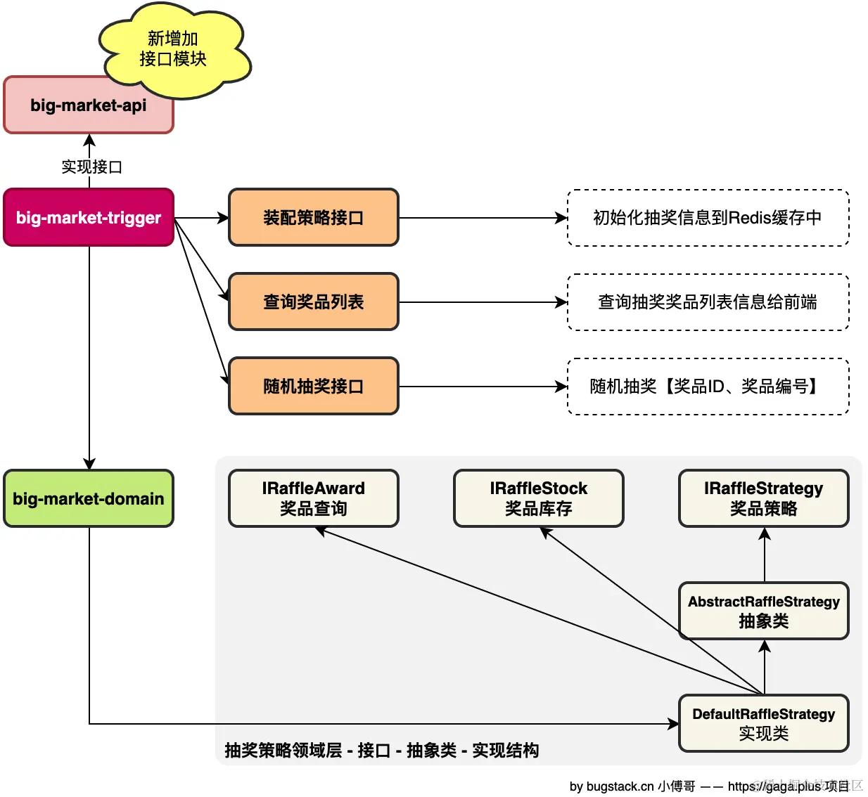 - 以PRD文档诉求和对功能的评审,设计出抽奖的领域模型功能,以及在抽奖的流程抽象上,分为;抽奖前、抽奖中、抽奖后,的节点上扩展各项行为动作。如抽奖前的人群判断、抽奖中库存扣减、抽奖后兜底奖励等。