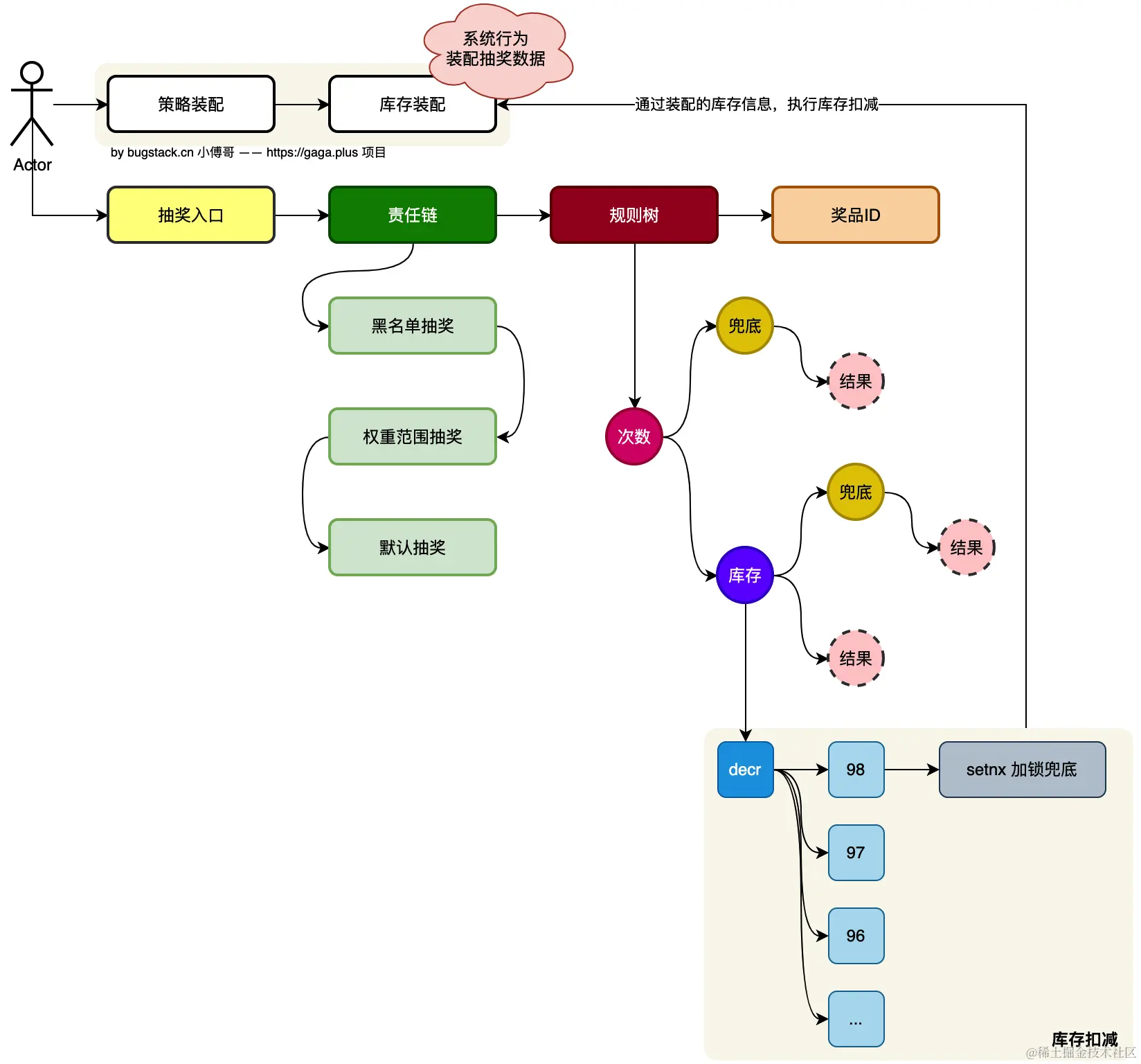 - 设计模板模式定义抽奖流程标准,再在模板模式中,调用责任链完成抽奖,对于抽奖中和后的动作使用组合模式的规则树进行动态处理【支持库表配置】。