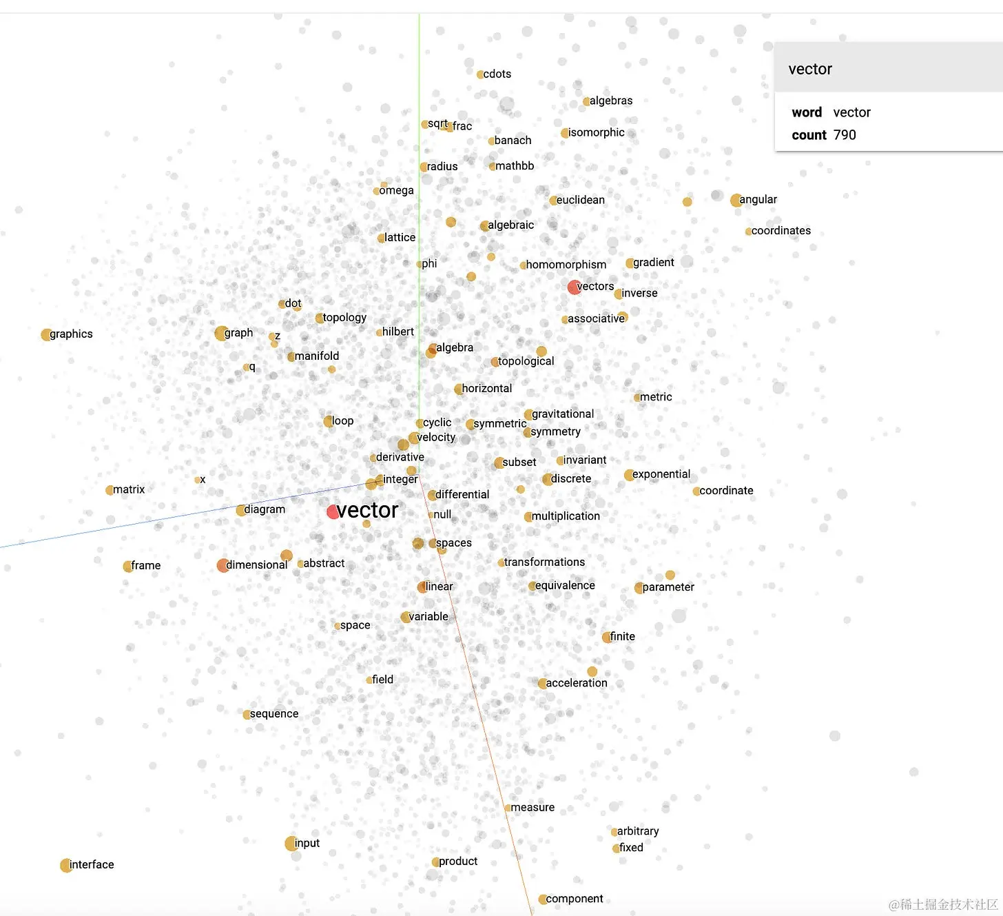 下面是使用 200 个维度的 Word2Vec 模型生成的嵌入的可视化。您可以使用 Tensorflow Projector 进行模拟.