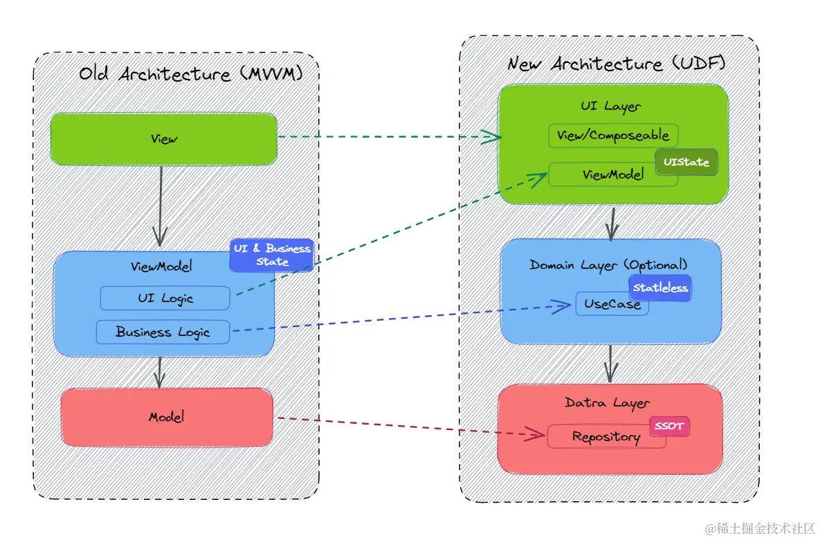 我们认为UI是UI元素和UI状态绑定在一起的结果. 所以UI Layer包含了View/Composeable和ViewModel. 或者说, 我们将原有的ViewModel拆分为页面ViewModel(UI State)和业务ViewModel.