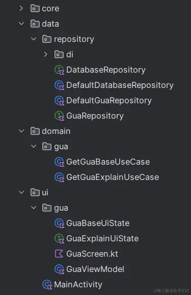 有两个UiState(GuaBaseUiState,GuaExplainUiState)的原因是页面中有两个部分, 一个部分是同步的内容更新, 还有一部分是异步(模拟网络获取)的内容更新.
