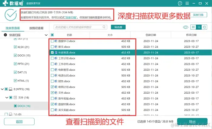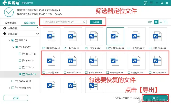 步骤4:在深度扫描结束后,可以再次对扫描到的文件进行查看和选择,在查看时,如果文件呈现比较多,建议直接在筛选器中输入相应的条件,完成选择后,点击【导出】 ,并选择一个与扫描磁盘不同的磁盘为保存位置。