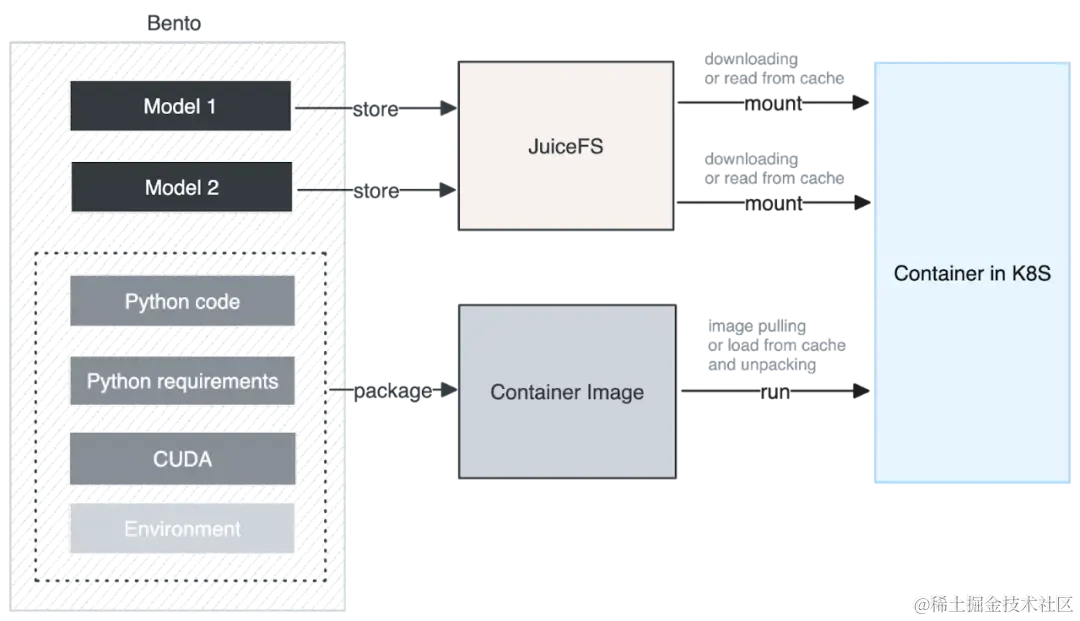 当 BentoML 在 Serverless 环境中部署模型时,其中一个主要挑战是冷启动慢,尤其在部署大型语言模型时更为明显。由于这些模型体积庞大,启动和初始化过程耗时很长。此外,由于 Image Registry 的带宽较小,会让大体积的 Container Image 进一步加剧冷启动缓慢的问题。为了解决这一问题,BentoML引入了JuiceFS。