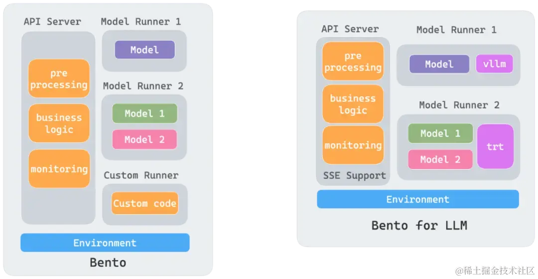 BentoML 是一个高度集成的开发框架,采用简单易用的方式,支持以开发单体应用的方式进行开发,同时以分布式应用的形式进行部署。这意味着开发者可以用很低的学习成本来快速开发一个高效利用硬件资源的大语言模型 AI 应用。BentoML 还支持多种框架训练出来的模型,包括 PyTorch、TensorFlow 等常用 ML 框架。起初,BentoML 主要服务于传统 AI 模型,但随着大型语言模型的兴起,如 GPT 的应用,BentoML 也能够服务于大语言模型。