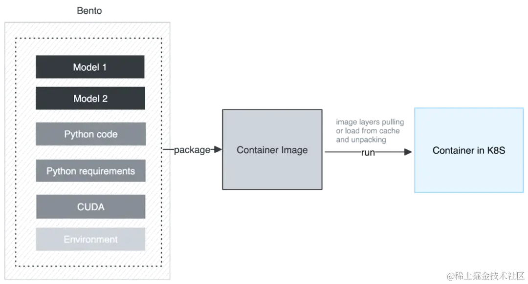 另一个挑战是当不同的 Bento 使用相同的模型时。这种架构会浪费多份相同的空间,并且被打包到不同的 Image 中,作为不同 Layer 存在,导致了多次下载和解压,这是极大的资源浪费。因此,这种架构无法共享模型。