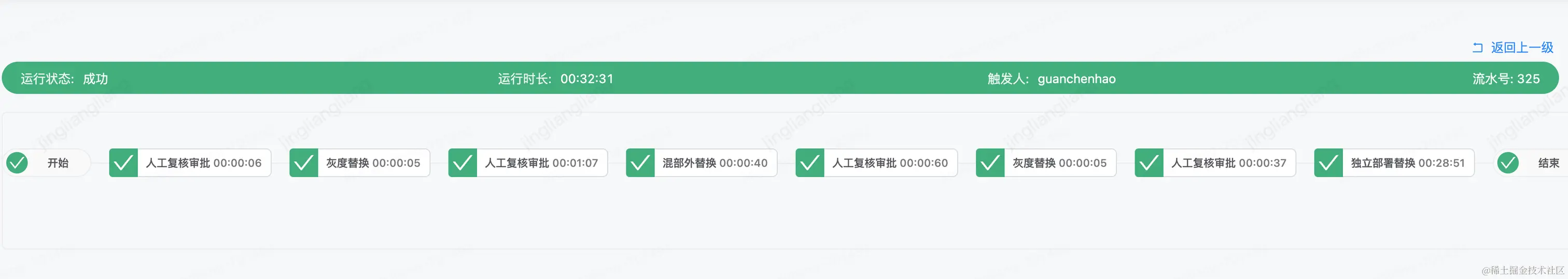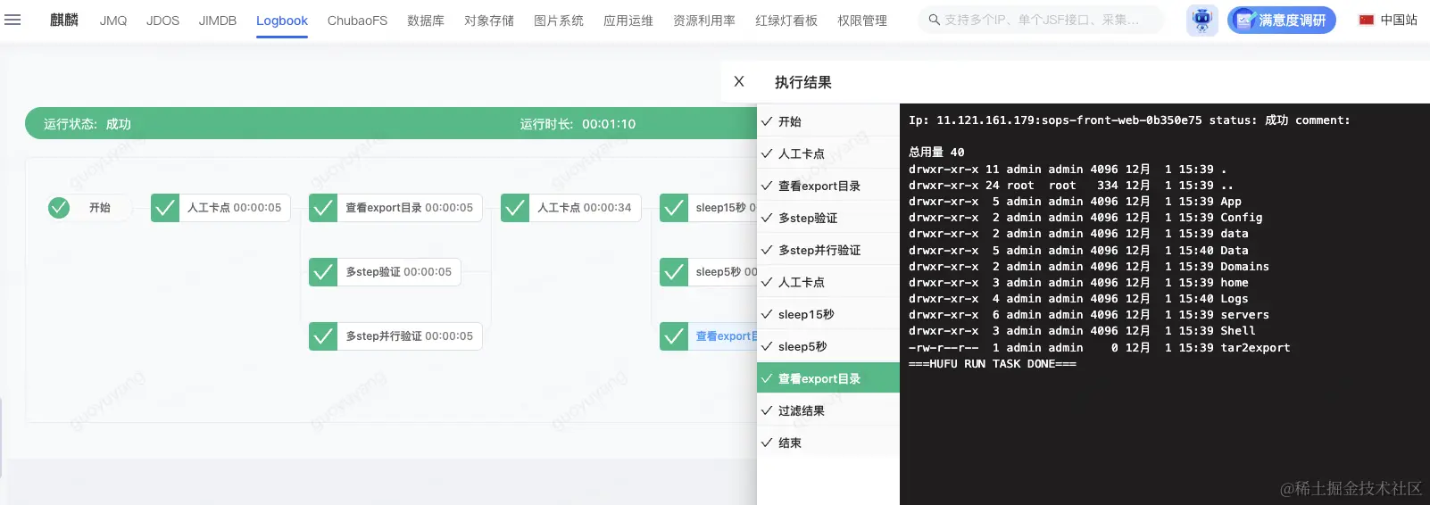 在泰山麒麟平台中执行后,支持查看运维功能执行中的参数、过程、结果以及运行日志。