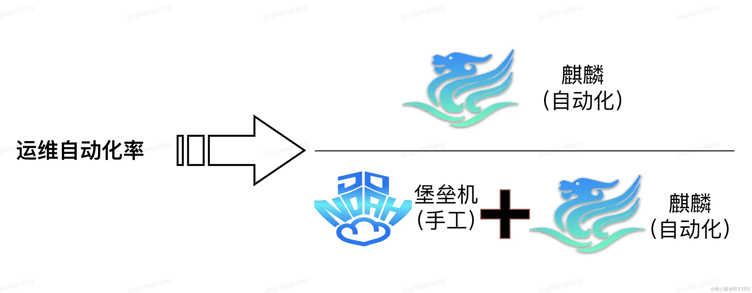 其中,分子表示通过泰山麒麟进行的自动化操作次数。这些操作可以是自动化运维命令、运维功能或自动化编排任务。分母表示通过堡垒机登录之后进行的手工操作的次数,再加上分子的数量。