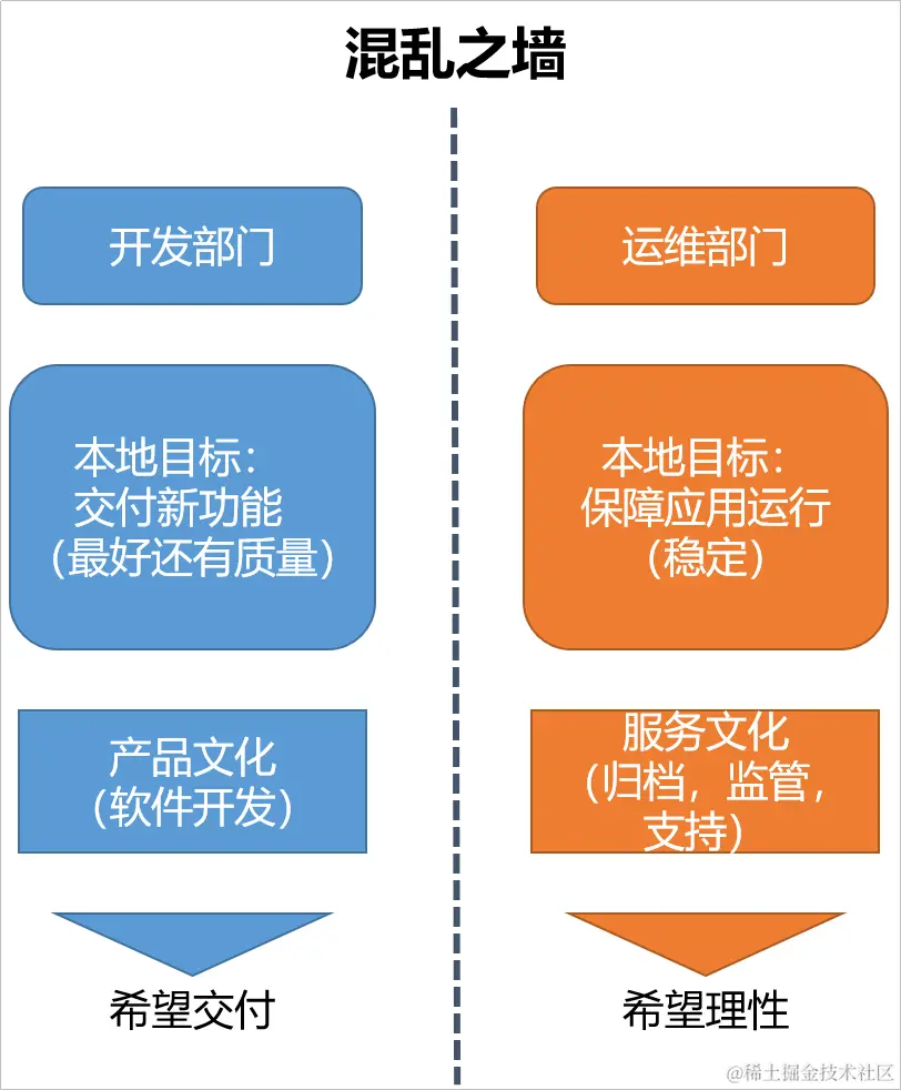 开发侧很快,运维侧太稳,这个就是我们常说的开发与运维之间固有的、根因的冲突,即下图中的混乱之墙。开发(尤其是“敏捷”后),求的是快速响应变化;运维,求的是稳定、安全和可靠的服务。更重要的,两者的KPI度量指标,绩效考核激励机制不同,决定了如果为达成各自的局部目标,势必存在无法调和的根因冲突。