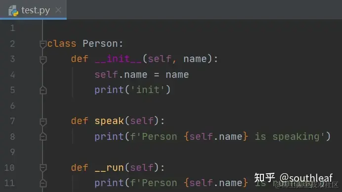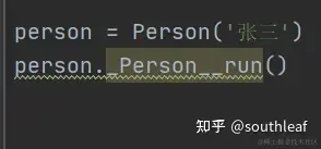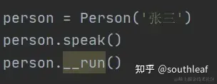 上图中定义了一个Person类,具备公有方法speak()和私有方法__run(),现在分别调用speak()方法和__run()方法,