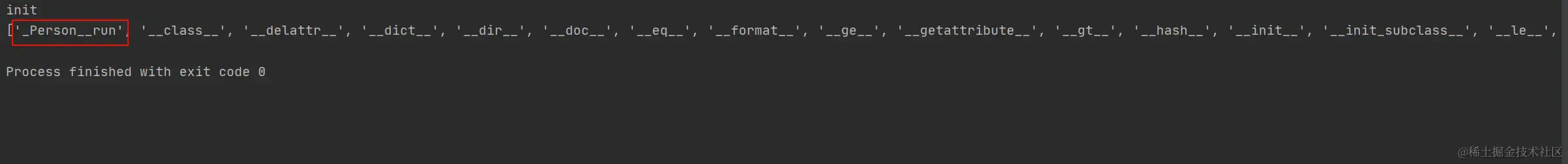 在Python中其实并没有真正的私有属性或者私有方法,底层在属性名或者方法名上做了一些处理,让调用者通过原属性名或者方法名无法直接调用,实际上是将真名隐藏了起来,但是通过dir()函数是可以看到,具体的格式如下: