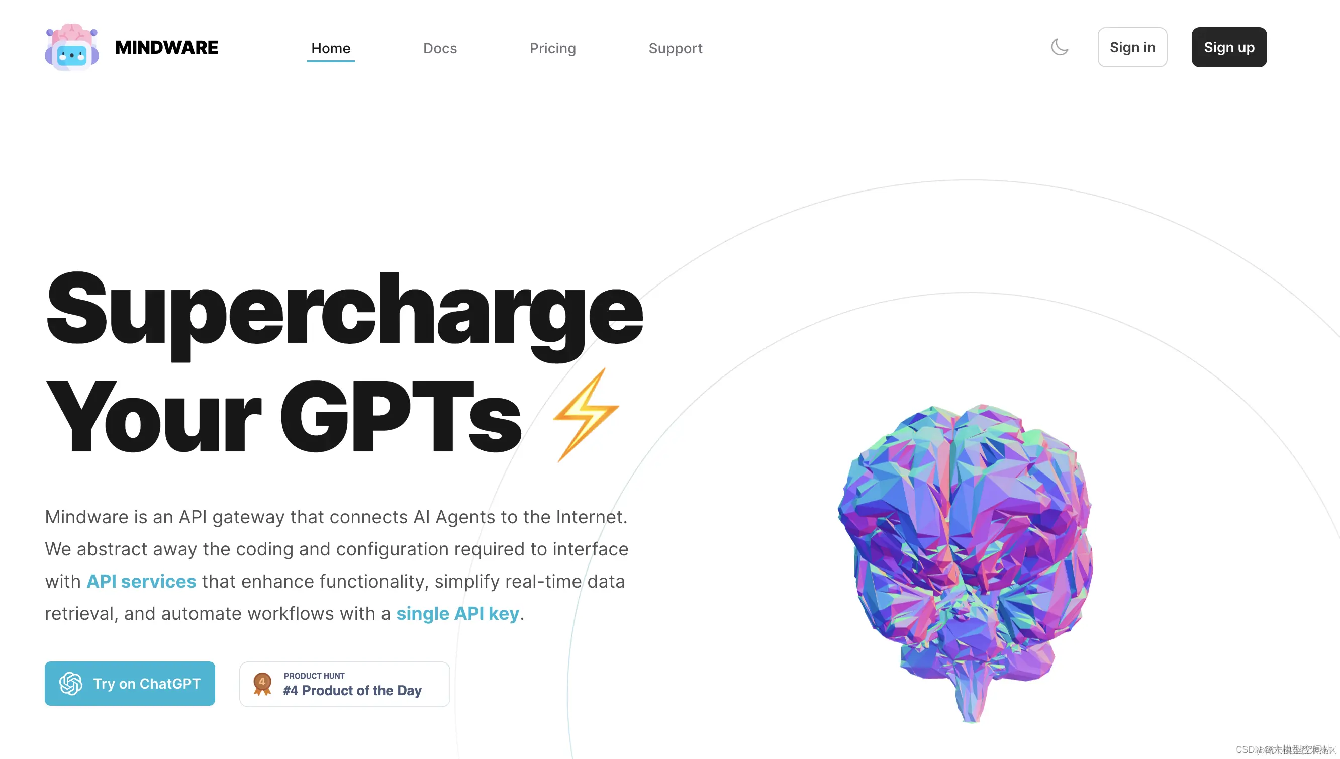 Mindware 提供了一个 API 网关服务,这个服务的主要目的是简化人工智能(AI)代理与互联网上各种API服务的集成过程。通过Mindware,开发者和企业可以更容易地将AI功能集成到他们的应用程序中,而无需处理复杂的编码和配置工作。简而言之,Mindware 是一个帮助开发者和企业更轻松地将AI技术融入到他们的产品和服务中的解决方案,它通过提供一个易于使用的接口和自动化工具,降低了技术门槛,加快了开发速度。