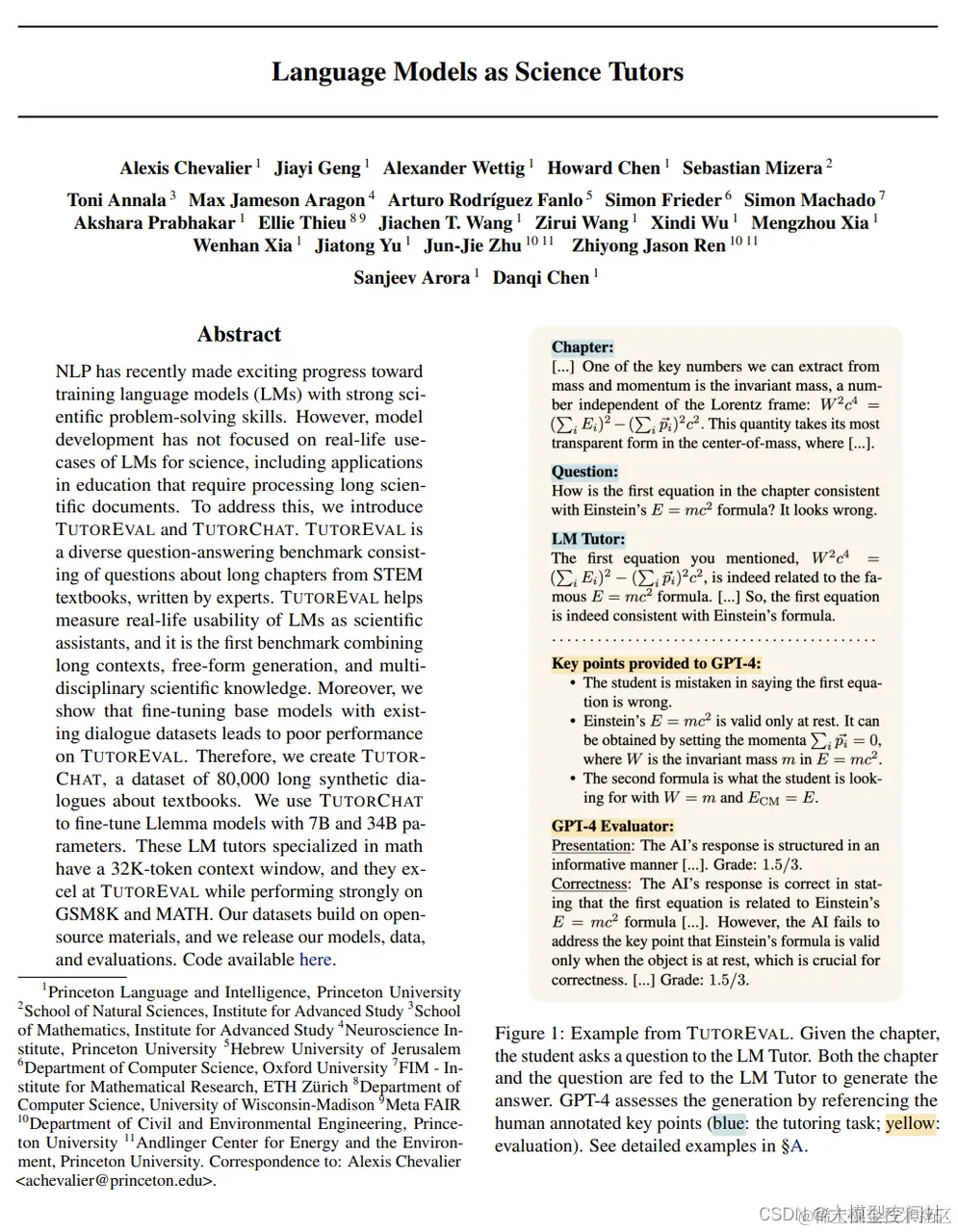 近期,NLP在训练具有强大科学问题解决能力的语言模型(LMs)方面取得了令人振奋的进展。然而,模型发展并未专注于LM在科学领域的实际用例,包括需要处理长篇科学文档的教育应用。为解决这一问题,我们引入了TutorEval和TutorChat。TutorEval是一个多样化的问答基准,包括针对STEM教材长篇章节的问题,由专家编写。TutorEval有助于衡量LM作为科学助手的实际可用性,它是首个结合长篇背景、自由生成和多学科科学知识的基准。此外,我们发现,将基础模型与现有对话数据集微调会导致TutorEval表现不佳。因此,我们创建了TutorChat,一个包含80,000个关于教科书的长篇虚拟对话的数据集。我们使用TutorChat对带有7B和34B参数的Llemma模型进行微调。这些数学专业的LM导师具有32K-token的上下文窗口,在TutorEval上表现出色,在GSM8K和数学方面也表现强劲。我们的数据集基于开源材料构建,我们发布了我们的模型、数据和评估结果。