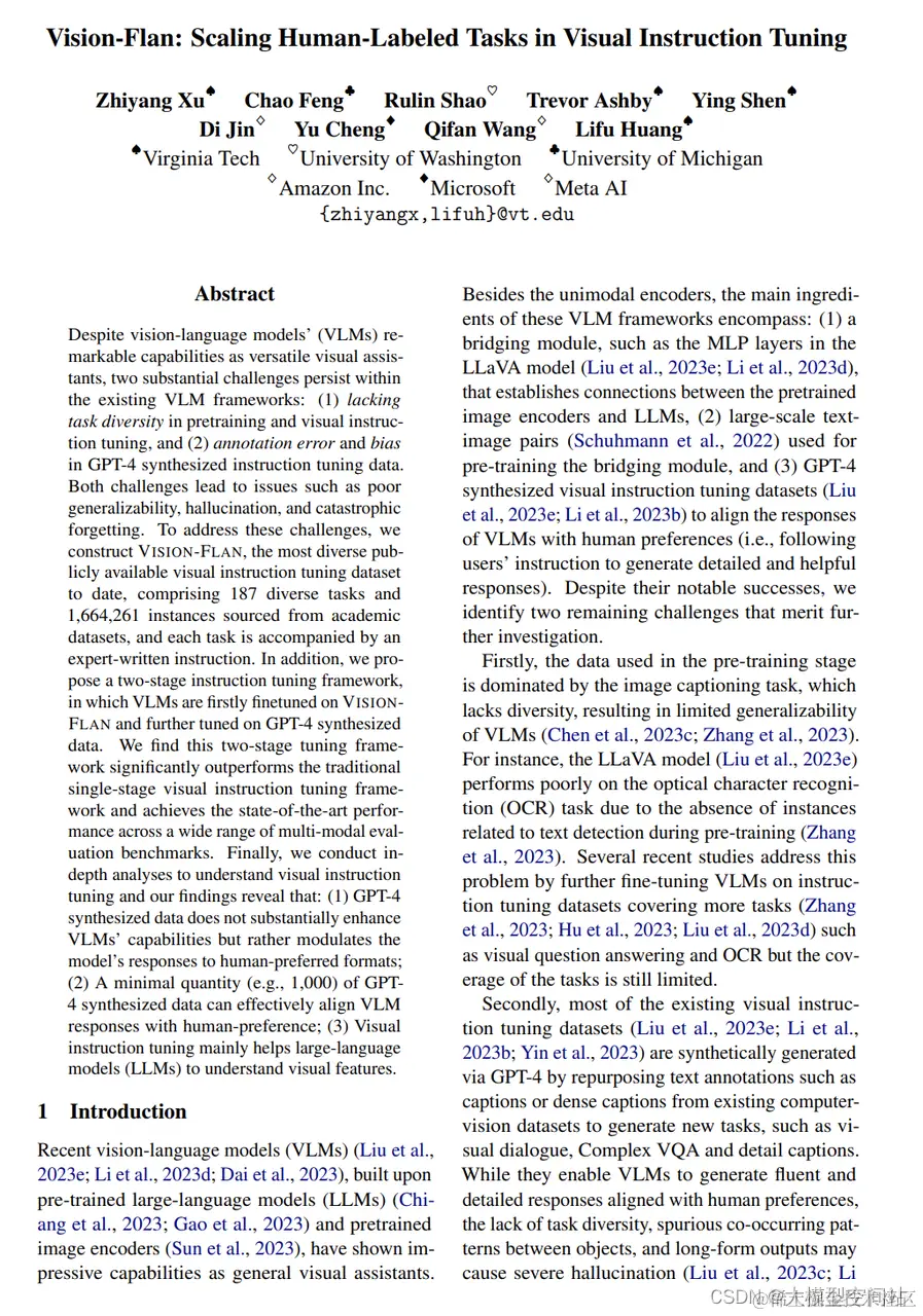 尽管视觉语言模型(VLMs)在作为多功能视觉助手方面具有显着能力,但现有VLM框架中仍存在两个重要挑战:(1)在预训练和视觉指导微调中缺乏任务多样性,以及(2)GPT-4合成指导数据中存在的注释错误和偏见。这两个挑战导致了诸如泛化性不佳、幻觉和灾难性遗忘等问题。为解决这些挑战,我们构建了迄今为止最多样化的公开可用的视觉指导微调数据集Vision-Flan,包括来自学术数据集的187个多样化任务和1,664,261个实例,每个任务都附有专家撰写的指导。此外,我们提出了一个两阶段指导微调框架,在该框架中,VLM首先在Vision-Flan上微调,然后在GPT-4合成数据上进一步微调。我们发现这种两阶段微调框架在各种多模态评估基准测试中显著优于传统的单阶段视觉指导微调框架,并取得了最先进的性能。最后,我们进行了深入分析以了解视觉指导微调,我们的研究结果表明:(1)GPT-4合成数据并没有显著提升VLM的能力,而是调节了模型对人类首选格式的响应;(2)微量(例如1,000)的GPT-4合成数据可以有效地将VLM的响应与人类偏好对齐;(3)视觉指导微调主要有助于大型语言模型(LLMs)理解视觉特征。