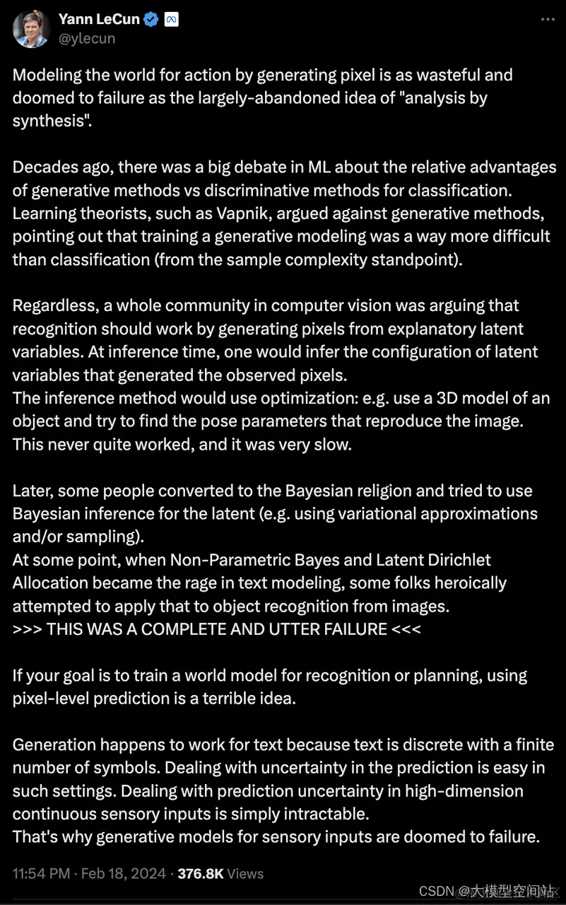 文本的生成恰好有效,因为文本是离散的,具有有限数量的符号。在这样的设置中处理预测中的不确定性很容易。处理高维连续感官输入中的预测不确定性简直是不可行的。这就是为什么针对感官输入的生成模型注定失败的原因。