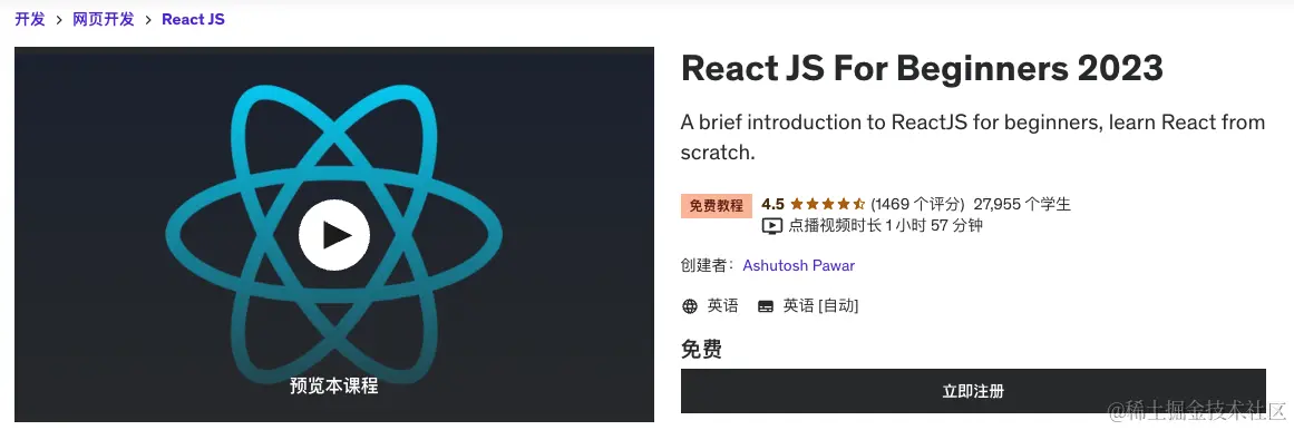本课程由 Ashutosh Pawar 教授。 他在 Udemy 上有他的 17 门课程。目前,React.js 初学者免费课程已有超过 27,000 名注册者,评分超过 1K。本课程的总分是 4.6 分(满分 5 分)。