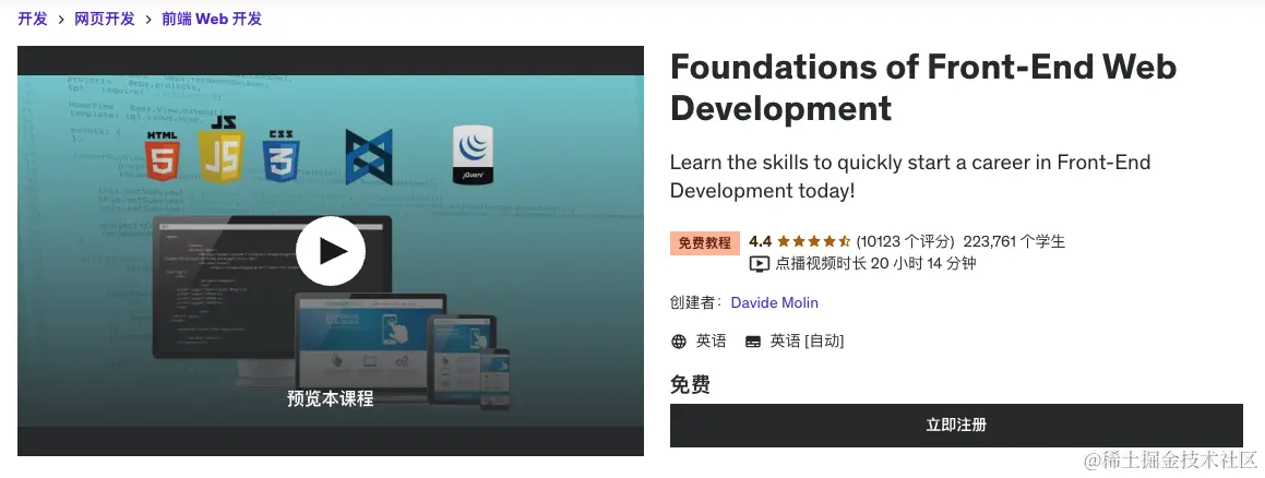 该课程由 Lorenz Tuton 授课,他在 Web 开发、图形设计方面经验丰富,擅长 HTML 和 CSS。 从他在 Udemy 上教授的 7 门课程来看。 截至目前,有近 40 万注册人数和超过 3 万个评分, 学生给这门课程打分 4.5 星(满分 5 星),属于同类最优质的免费教程了。